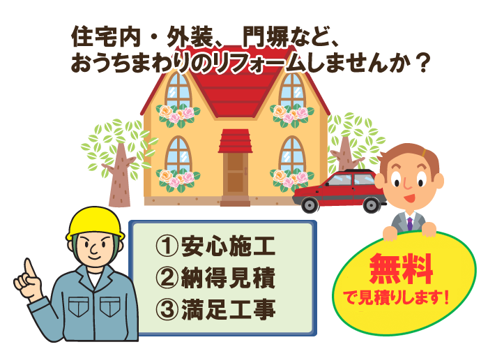 | 事業内容 | 住宅内装、外装、屋根ふき替え、門塀塗装・施工など住宅に関するリフォーム全般 |